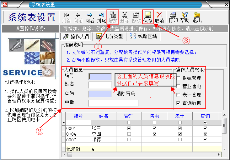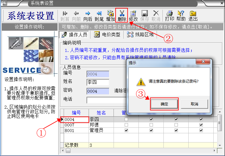 系統(tǒng)默認(rèn)的管理人員有“張三、李四、德邦、管理員”。 其中“管理員”是最高權(quán)限擁有者,不能刪除。其它人員能夠隨意刪除增加。