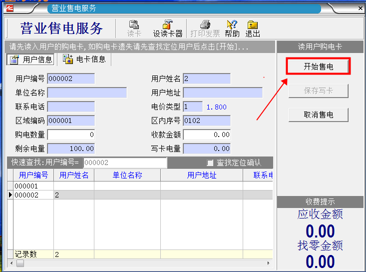 1.首先把用戶購(gòu)電卡插入讀卡器,然后單擊“營(yíng)業(yè)售電