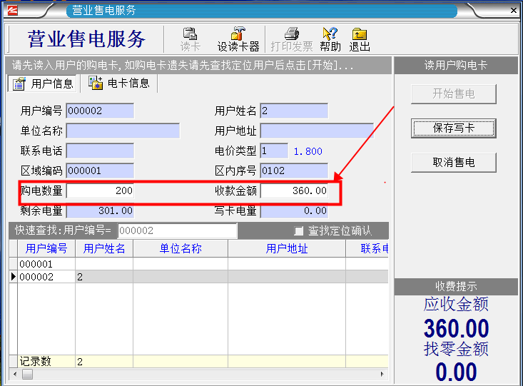 5、輸入完成“購(gòu)電金額”以后,按回車鍵一次,右上角的“保存寫卡”才會(huì)生效。