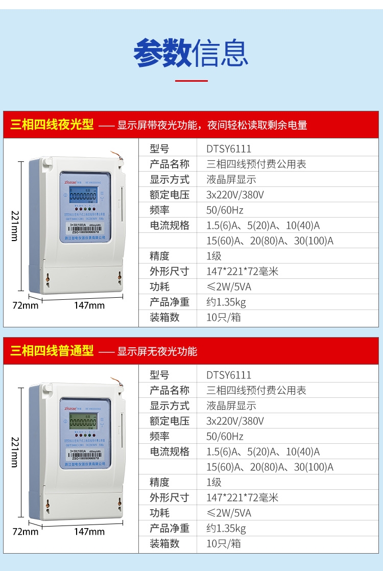 (四)三相預付費電度表(公用表)的參數信息:產品名稱、顯示方式、額定電流、頻率、電流規格、精度、外形尺寸、功耗、產品重量,裝箱數等信息,具體如下
